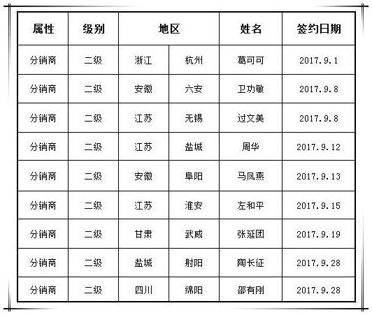 【國泰訊】近日,自集團營銷發(fā)展中心最新數(shù)據(jù)顯示,進入九月以來,公司渠道開發(fā)又出新成績,新增簽約合作伙伴九家。他們分別來自杭州、六安、無錫、鹽城、阜陽、淮安、武威、射陽、綿陽等,至此國泰集團渠道的開拓工作又登上了一個新的臺階!